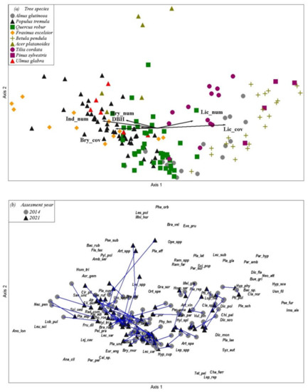 - Czerepko, J.; Gawryś, R.; Szymczyk, R.; Pisarek, W.; Janek, M.; Haidt, A.; Kowalewska, A.; Piegdoń, A.; Stebel, A.; Kukwa, M.; et al. How sensitive are epiphytic and epixylic cryptogams as indicators of forest naturalness? Testing bryophyte and lichen predictive power in stands under different management regimes in the Białowieża forest. Ecol. Indic. 2021, 125, 107532. [Google Scholar] [CrossRef]