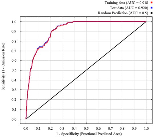 The training AUC and TSS obtained via MaxEnt analysis were 0.918 and 0.926, respectively. The output results show an excellent model performance, and the model was robust in predicting the distribution of the target species (Figure 1).