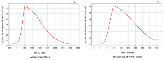 Response curves of predicted probabilities to critical environmental factors. (a) Bio12 is annual precipitation. (b) Bio13 is precipitation of wettest month.