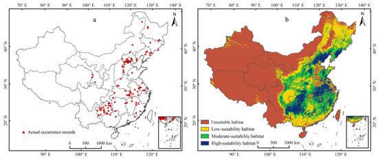 The actual and predicted distribution of Entodon challengeri under the current climate scenario based on the MaxEnt model in China. (a) Actual occurrence records. (b) Current geographical distribution predicted using the MaxEnt model. Unsuitable habitat is represented by red; low-suitability habitat is represented by yellow; moderate-suitability habitat is represented by green; high-suitability habitat is represented by blue.