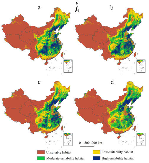 Moreover, the adverse effects were predicted to be more pronounced in RCP8.5 than in RCP2.6 and more serious in the 2070s than in the 2050s. This means that climate warming threatens the survival of E. challengeri, and with the intensification of climate warming over time, the range of suitable habitat areas will decrease further. Compared with the present distribution range, the future predicted distribution range showed a trend of ‘northern expansion and southern shrinkage’. Additionally, the northern range boundaries of climatically suitable habitats for E. challengeri in China were predicted to extend further north. Notably, southern China and the Sichuan Basin were at high risk for habitat loss, and special attention should be given to their preferential protection. These two zones are typified by flat terrain, fertile soil, and warm and humid climates [41], which are ideal suitable habitats for E. challengeri. Hence, the loss area predicted in this study should be taken as the priority area for monitoring.