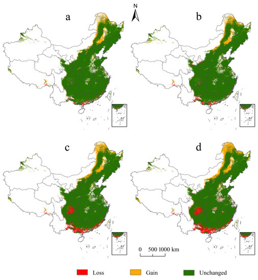 In terms of spatial scale, among the different levels of suitable habitats, the high-suitability habitats of E. challengeri decreased most significantly (Figure 5a–d). In addition, although the suitable habitats experienced gains and losses under the future climate scenarios, the range of losses was larger than the range of gains (Figure 6a–d). Gains and losses were predicted to occur in the northernmost and southernmost regions of China, respectively. In detail, the gains were located in northeast China, including in the Greater Khingan Mountains and the Lesser Khingan Mountains. The losses mainly occurred in the southern regions of the Yunnan, Guangdong, Guangxi, and Fujian Provinces, followed by the Sichuan Basin. The total suitable area of E. challengeri showed a decline of 8.80–35.88% within all future scenarios compared with the current area; in particular, the decline in the RCP8.5 scenario was greater than that in the RCP2.6 scenario. In terms of temporal scale, high-suitability habitats, total suitable area, and losses varied more in the 2070s than in the 2050s (Table 3).