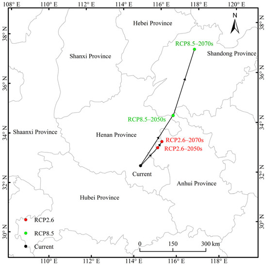 The current distributional centroid was predicted to be located in Henan Province (114°30′36″ E, 32°36′36″ N). In RCP2.6, the distributional centers were located in northern Anhui Province, and they moved from the centroid (115°24′36.05″ E, 33°18′36″ N) in the 2050s to the centroid (115°37′48″ E, 33°32′24.09″ N) in the 2070s. In RCP8.5, the center (116°16′12.03″ E, 34°34′11.93″ N) in the 2050s located in Anhui Province migrated to the center (117°36′36″ E, 37°10′12.07″ N) in the 2070s in Shandong Province. Taken together, the centroids migrated to the northeast of high latitudes, and the migration distance in RCP8.5 was far greater than that in RCP2.6 (Figure 7).