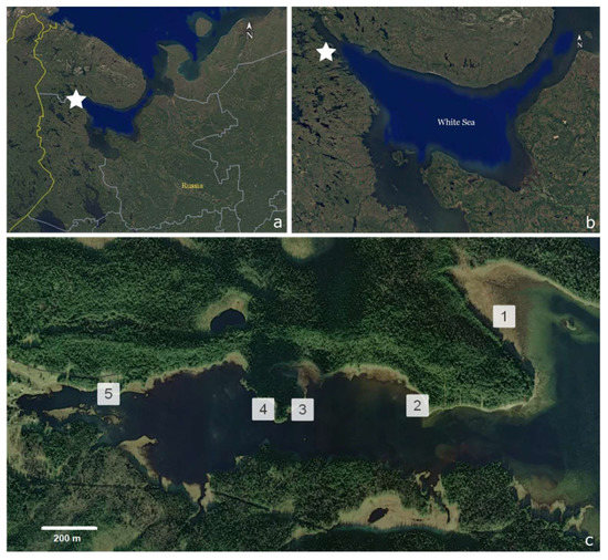 Sampling sites in the White Sea. (a,b) The white stars on the satellite images showing the location of Chernaya River estuary. The basis for the maps (a,b) was https://www.google.com/maps/ (accessed on 5 June 2023). (c) A scheme of the locations of stations 1–5 in the estuary; numbers in the figure showing exact sampling sites at each station. The basis for the map (c) was https://360earthview.com/ (accessed on 5 June 2023).