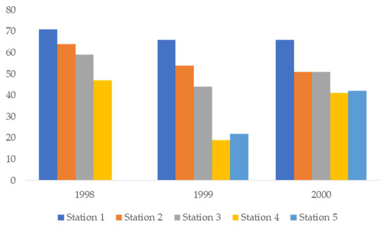 Each year, between 21 and 65 taxa were detected in one sample at station 1, between 15 and 46 taxa were detected at station 2, between 7 and 36 taxa were detected at station 3, between 6 and 27 taxa were detected at station 4 and between 8 and 30 taxa were detected at station 5.