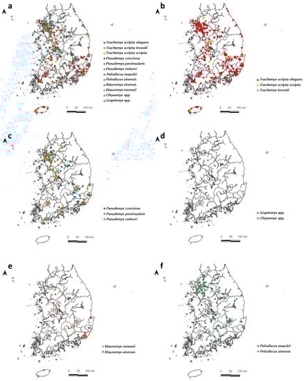 Domestic distribution of turtles identified based on the results of the National Ecological Institute’s “National Habitat Survey of Alien Species” from 2014–2022. (a) all turtles; (b) Trachemys spp.; (c) Pseudemys spp.; (d) Graptemys spp. and Chrysemys spp.; (e) Mauremys spp.; (f) Pelodiscus spp.