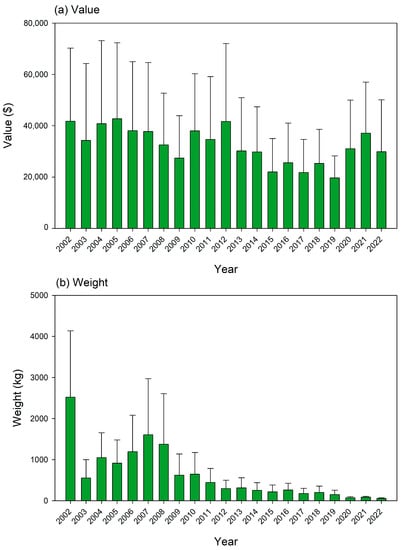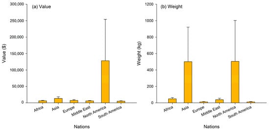Since 2002, the overall volume of imports decreased (Figure 2b), whereas the number of imports and countries from which the imports came steadily increased, with an average of 20 importing countries (Table 4). The volumes imported from Asia and North America were similar, with average weights of 501 and 505, respectively. However, the monetary value of imports from North America was significantly higher (Figure 3 and Figure 4).