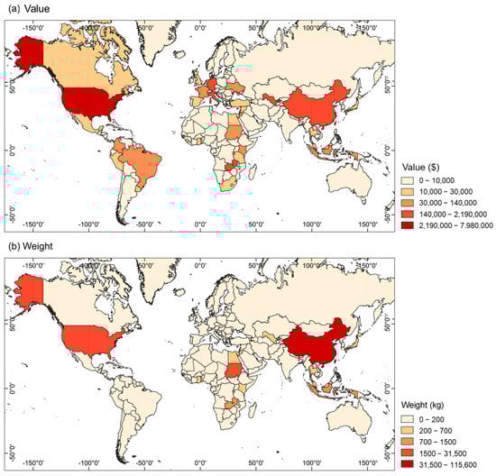 Since 2002, the overall volume of imports decreased (Figure 2b), whereas the number of imports and countries from which the imports came steadily increased, with an average of 20 importing countries (Table 4). The volumes imported from Asia and North America were similar, with average weights of 501 and 505 respectively. However, North America had a significantly higher import value (Figure 3 and Figure 4).