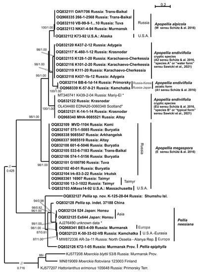 liverworts; Apopellia; molecular analyses; morphology; phylogeny; systematics; distribution; Eurasia; America 1. Introduction