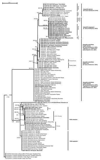 The main aim of this paper is to clarify the phylogeny and taxonomy of the genus Apopellia, as well as distribution of its species. One of the challenges was to sequence specimens of Apopellia megaspora collected by the first author during an excursion with R. Schuster to Conway (Massachusetts, Schuster’s privite area in Green River Valley), from where Schuster described this species, and thus obtain a DNA loci of A. megaspora from the site shown by Schuster as the type locality. Another goal was to consider how to treat the Western North American specimens, which, based on their distribution, ecology and morphology, can be attributed to A. alpicola. A further task was to find out whether A. megaspora really occurs in the Asian part of Russia, as maintained by Schütz et al. [11], in which the sequenced specimen from Turukhansk, valley of the Yenisei River Krasnoyarsk Territory (not Lena, where the authors mistakenly placed it), turns out to be in one of the subclades of A. megaspora, along with Western North American specimens. Finally, we clarify the global distribution of the genus.