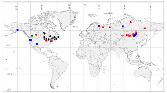 Distribution of Apopellia megaspora (red dots represent localities of sequenced specimens, black dots localities based on Schuster, 1992) and A. alpicola (blue squares represent localities of sequenced specimens, green square locality based on Schuster, 1981); brown rhomb sequenced specimen of Apopellia endiviifolia.