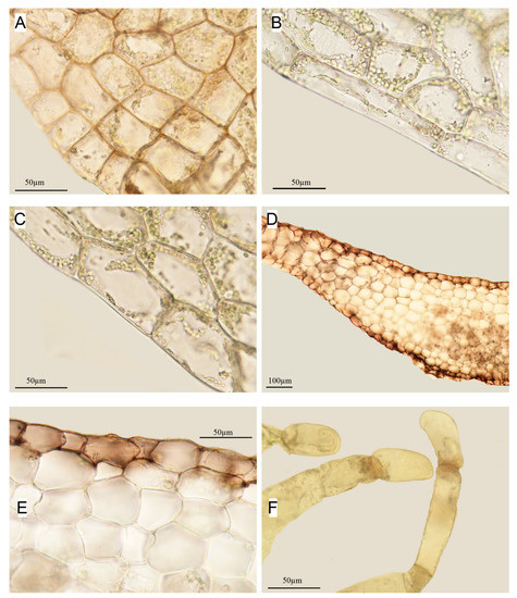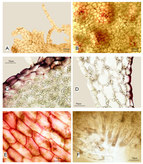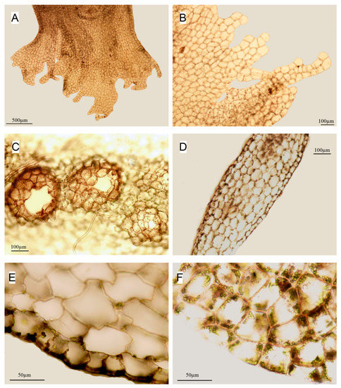 Apopellia endiviifolia (A,B)—perianth mouth; (C)—antheridia cavities; (D)—cross-section; (E)—part of cross-section showing small cells of epidermis contrasting with large cells of medula; (F)—cells of dorsal side of thallus along margin; (all from KPABG 113353).