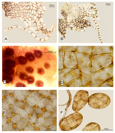 Apopellia megaspora: (A,B)—perianth mouth; (C)—group of antheridia cavities; (D)—capsule inner wall cells; (E)—capsule epidermal cells; and (F)—spores & elaters; (A,B) from KPABG 123479; and (C–F) from KPABG-116783).