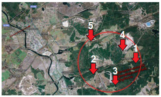 This study was conducted in spring–summer periods between 2005 and 2021 (once every 4 years). It took place at permanent monitoring sites located within the Lopatinsky phosphate rock mine region (55°17′44″ N 38°49′57″ E). This area currently represents a giant abandoned phosphate rock deposit near Voskresensk in the Moscow Region (Figure 1). The climate of this area is moderately continental, with relatively hot summers and moderately cold winters. Forest–steppe and steppe dominate the territory. Soils are primarily medium-sized dark.
