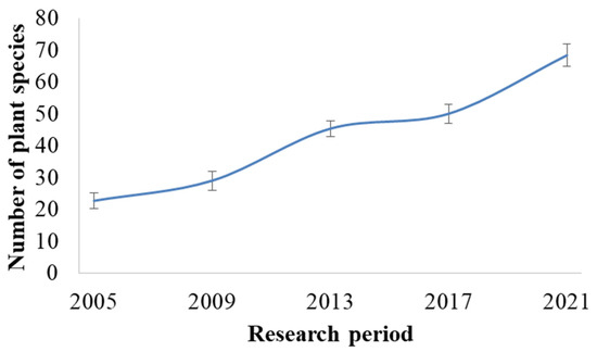 Since the mining of phosphorites was terminated in 1993, demutational changes involving previously extinct plant species or the introduction of new plant species into the area due to successional processes were examined. In previous research (2005), the floristic composition of the mine site was quite poor, with only 23 species (Figure 2). Already by spring 2021, 68 species had been identified (occurring on more than 20% of the territory’s five vegetated plots).