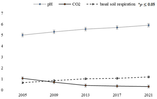 Average physical and chemical properties of soil samples from the Lopatinsky phosphorite mine: pH, CO2 (%) and basal soil respiration rate (mg CO2/m2/h) in 2005–2021. The values are presented as mean ± standard deviation (SD). * values are statistically significant at p ≤ 0.05.
