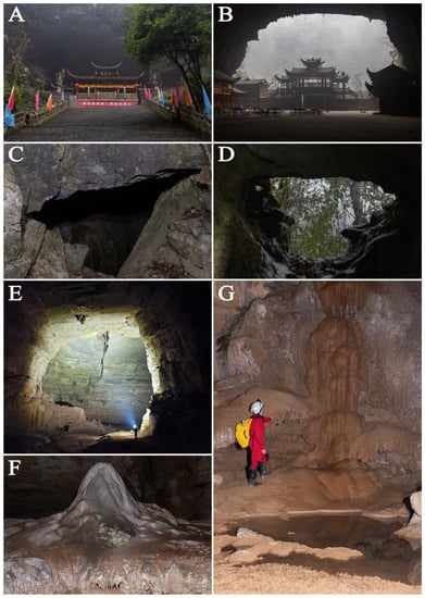 Entrances and habitats of Feihu Dong: (A,B) the main entrance, “Large Porch Entrance”; (C,D) the entrance of “Tiger Eye”; (E) Waterfall Gallery; (F,G) speleothems.