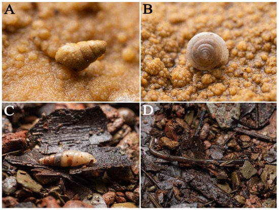 Animals found in Feihu Dong: (A) Subulinidae sp.; (B) Helixarionoidea sp.; (C) Synprosphyma cf. lyra (Gredler,1887); (D) Oligochaeta sp.