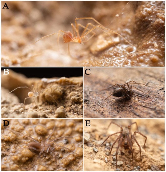 Animals found in Feihu Dong: (A) Telema wunderlichi Song and Zhu, 1994; (B) Belisana sp.; (C) Linyphiidae sp.; (D) Agelenidae sp.; (E) Papiliocoelotes guitangensis Zhao and Li, 2016.