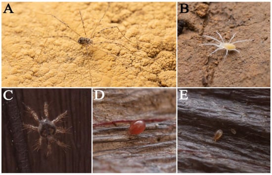 Animals found in Feihu Dong: (A) Schenkeliobunum cf. wuxi Lu, Wang and Zhang, 2022; (B) Rhagidiidae sp.; (C) Spinturnicidae sp.; (D) Acari sp. 1; (E) Acari sp. 2.