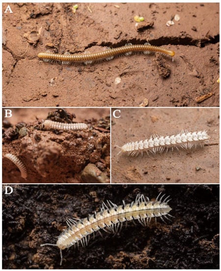- Li, Q.; Pei, S.; Guo, X.; Ma, H.; Chen, H. Australobius Tracheoperspicuus sp. N., the first subterranean species of centipede from southern China (Lithobiomorpha, Lithobiidae). ZooKeys 2018, 795, 83–91. [Google Scholar] [CrossRef]