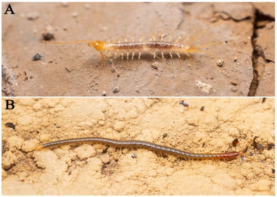 Animals found in Feihu Dong: (A) Lithobius (Monotarsobius) sp.; (B) Geophilidae sp.