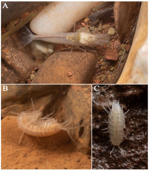 Crustaceans are represented by three moderately troglomorphic species, viz., Caridina longshan (Figure 10A), Gammarus sp. (Figure 10B), and Trogloniscus sp. (Figure 10C). All of them lack either pigment or eyes. Gammarus are common in most of the aquatic microhabitats inside Feihu Dong. Caridina longshan was collected in Flu Meander, and Trogloniscus sp. was collected in the Régis Gremmel River (Figure 4F).