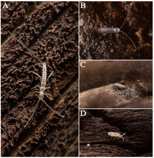 Animals found in Feihu Dong: (A) Campodeidae sp.; (B,C) Tomocerus sp.; (D) Coecobrya sp.