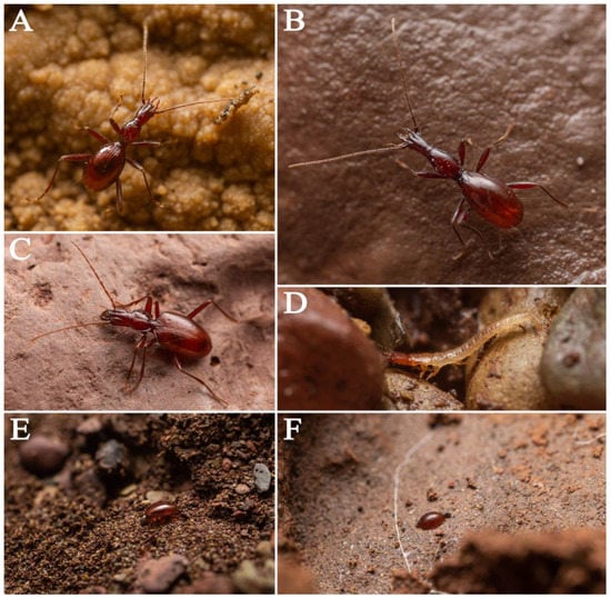 Animals found in Feihu Dong: (A) Toshiaphaenops ovicollis Ueno, 1999; (B) Huoyanodytes tujiaphilus Tian and Huang, 2016; (C–E) adult, larva, and elytra of Cathaiaphaenops (Cathaiaphaenops) delprati Deuve, 1996; (F) elytra of Toshiaphaenops ovicollis Ueno, 1999.