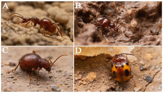 For staphylinids, the troglomorphic Zopherobatrus tianmingyii (Figure 13A), which is also reported from a limestone cave in Guizhou [], was found near Tiger Eye, accompanied with a lot of springtails, while a possibly troglophile Nipponobythus (Figure 13B) species was found alone near the Waterfall No. I. The genus Zopherobatrus contains three species, all troglobionts with reduced eyes, previously known from Guizhou, Chongqing, and Sichuan []. Quedius feihuensis Smetana, 1999 was collected together with Cathaiaphaenops. In spite of being only known from Feihu Dong, the species has no troglomorphic character and is likely a trogloxene [].