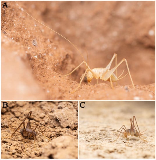 - Gorochov, A.V.; Rampini, M.; Di Russo, C. New species of the genus Diestrammena (Orthoptera: Rhaphidophoridae: Aemodogryllinae) from caves of China. Russ. Entomol. J. 2006, 15, 355–360. [Google Scholar]