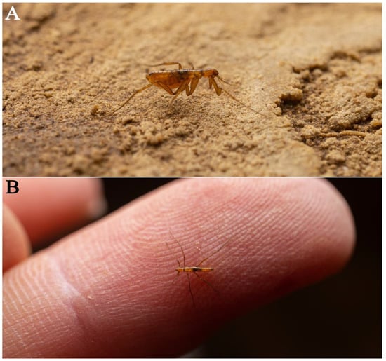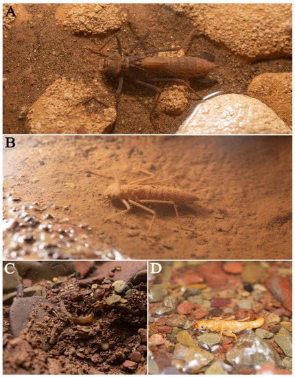 A Campodeidae species (Figure 11A) inhabits the dried and sandy habitats of the Régis Gremmel River. It occurs individually and keeps crawling all the time. The combination of its long antennae, cerci, and large size suggests that the species might be a troglobiont. The knowledge of the eight species of Chinese cave-dwelling Campodeidae was summarized by Sendra et al. in 2021 []. Remarkable troglomorphic features are obvious in most species, and the Feihu Dong Campodeidae is another highly troglomorphic species of southern China.