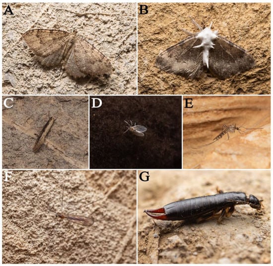 Animals found in Feihu Dong: (A,B) Triphosa sp.; (C) Tineidae sp.; (D) Psychodinae sp.; (E) Culicidae sp.; (F) Limoniidae sp.; (G) Anisolabididae sp.