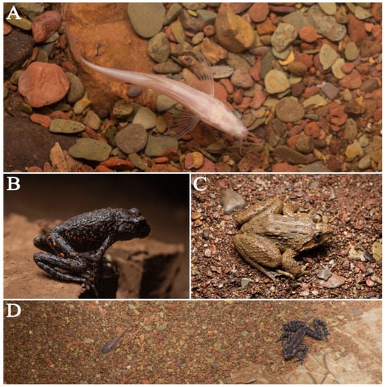 Animals found in Feihu Dong: (A) Triplophysa xiangxiensis (Yang, Yuan and Liao, 1986); (B) adult Oreolalax rhodostigmatus Hu and Fei, 1979; (C) Rana sp.; (D) larva and adult Oreolalax rhodostigmatus Hu and Fei, 1979.
