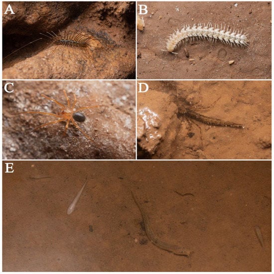 Moreover, the newly discovered passages of Feihu Dong may also potentially connect to other caves, such as Tujiamei Dong (Chushui Dong or Parking Cave “Grotte du Parking”), which could increase the richness of species in the area. Tujiamei Dong, which has been partly surveyed, is very likely linked to Feihu Dong as an outlet for water (Huang, S.B., pers. comm.). It has some species in common with Feihu Dong: the terrestrial species of four cave ground beetles, Toshiaphaenops ovicollis, Huoyanodytes tujiaphilus, Cathaiaphaenops delprati and Sinotroglodytes bedosae [], and millipede Glyphiulus deharvengi; as well as a large number of aquatic species, including shrimps Caridina longshan, blind fish Triplophysa xiangxiensis, and mud fish Cobitidae sp. (Figure 20E). But it has other species that are absent from Feihu Dong: the millipede Epanerchodus tujiaphilus Liu and Golovatch, 2018 (Figure 20B) [], a widespread troglophilic scutiger Thereuopoda clunifera (Wood, 1862) (Figure 20A), a spider Nesticella huomachongensis Lin, Ballarin and Li, 2016 (Figure 20C), and a nymph of damselfly Synlestidae sp. (Figure 20D).