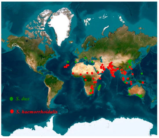 Distribution of the occurrence records of S. dux and S. haemorrhoidalis.