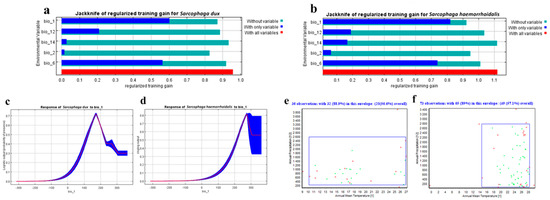The Jackknife test of the most important variables (a) for S. dux and (b) for S. haemorrhoidalis. Response curves of the most effective bioclimatic factor (bio 1) in flies’ distribution: (c) for S. dux and (d) for S. haemorrhoidalis. Two-dimensional niche between Annual Temperature (bio 1) and Annual Precipitation (bio 12): (e) for S. dux and (f) for S. haemorrhoidalis.