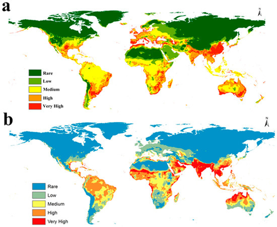 Predicted current potential global distribution: (a) for S. dux and (b) for S. haemorrhoidalis.