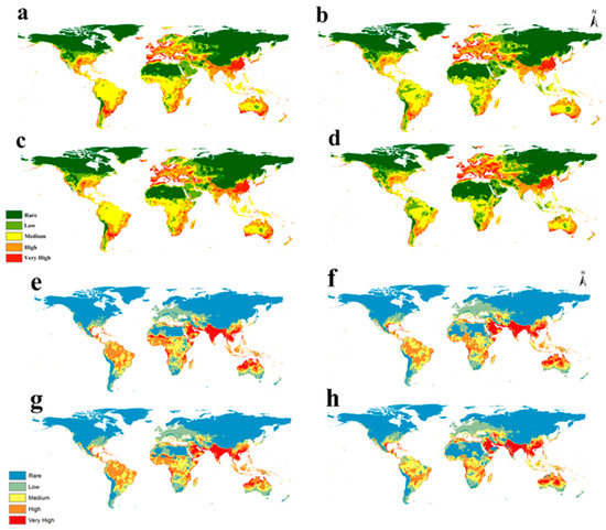 Predicted global future distribution of under two RCPs: (a) RCP 2.6 in 2050, (b) RCP 8.5 in 2050, (c) RCP 2.6 in 2070, and (d) RCP 8.5 in 2070 for S. dux; (e) RCP 2.6 in 2050, (f) RCP 8.5 in 2050, (g) RCP 2.6 in 2070, and (h) RCP 8.5 in 2070 for S. haemorrhoidalis.