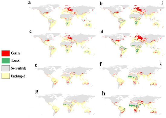 Calibration maps showing gain and loss in habitat suitability through the four future scenarios against the current status: (a) RCP 2.6 in 2050, (b) RCP 8.5 in 2050, (c) RCP 2.6 in 2070, and (d) RCP 8.5 in 2070 for S. dux; (e) RCP 2.6 in 2050, (f) RCP 8.5 in 2050, (g) RCP 2.6 in 2070, and (h) RCP 8.5 in 2070 for S. haemorrhoidalis.