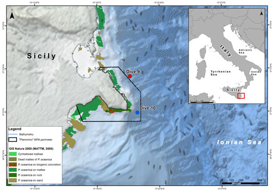 Location of study area with main habitat distribution (GIS Natura 2000 [59]) indicated. Black line indicates the perimeter of Plemmirio Italian Marine Protected Area. Background bathymetry was obtained from EMODnet.