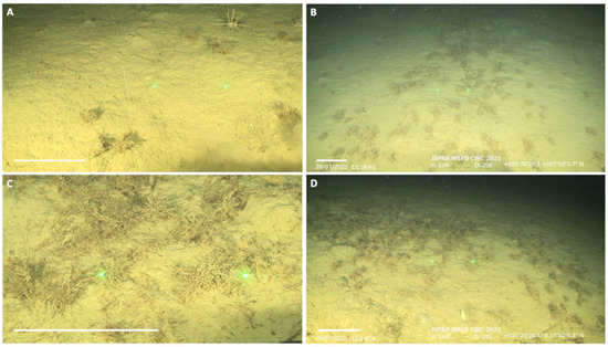 In July 2021, a research campaign was carried out onboard the R/V Astrea of ISPRA—Italian Institute for Environmental Protection and Research—in the Ionian Sea. During two exploratory dives, carried out in the depth range of 166 to 236 m using a ROV (Perseo, L3 Calzoni), the presence of rich assemblages of Amage adspersa tubes was revealed (Figure 1 and Table 1). The ROV was equipped with a Kongsberg high-definition video camera (1920 × 1080 pixels), two lasers 16 cm apart for use as a metric scale, and a manipulator arm used to take biological samples. ROV position was acquired every 2 s using an ultrashort baseline (USBL) underwater compact positioning system (µPAP 200, Kongsberg) with up to 0.25 accuracy. Specific attention was paid to maintaining a constant ROV cruising speed of approximately 0.5 knots and an altitude of approximately 1.5 m from the bottom.