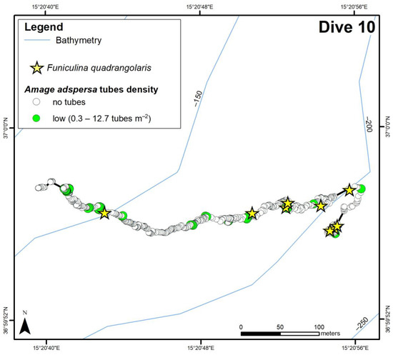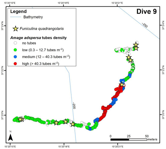 Spatial distribution of Amage adspersa along the ROV tracks (D9 and D10) with indication of relative species abundance and presence of Funiculina quadrangularis.
