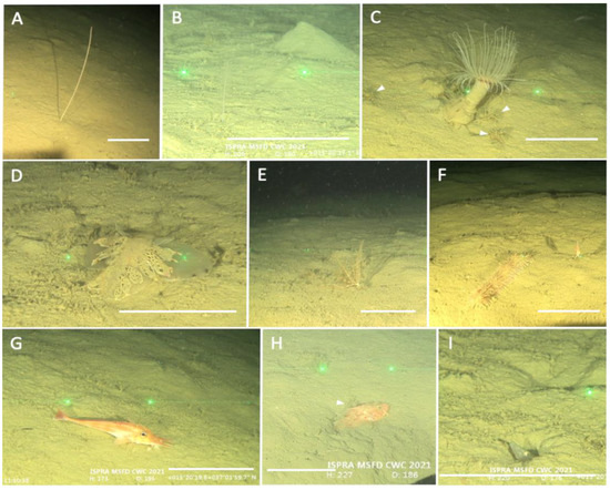 Megaebenthic species of the study areas. (A) Funiculina quadrangularis; (B) Virgularia mirabilis; (C) Cerianthus membranaceus and Amage adspersa (white arrows); (D) Tethys fimbria; (E) Leptometra phalangium; (F) Parastichopus regalis and Macroramphosus scolopax; (G) Peristedion cataphractum; (H) Scorpaena elongata and Amage adspersa (white arrow); (I) Ophisurus serpens. Scale bar: 16 cm.
