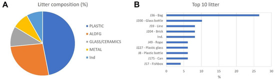 Litter composition in the study area. (A) Percentage of seafloor macrolitter categories; (B) percentage of Top-10 seafloor litter items (%).