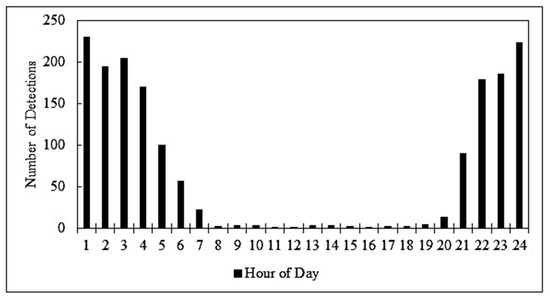 We accumulated 1696 unique armadillo detections during the course of this study. We found that armadillos were primarily nocturnal with some detections occurring around sunrise or sunset (Figure 1). We detected very few armadillos active during the day (Figure 1). In total 1461 armadillo detections were nocturnal (86%), 27 were diurnal (2%), and 208 were crepuscular (12%), i.e., within 1 h of sunrise or sunset.