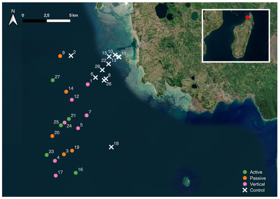 Study area (south-eastern Nosy Be, in north-western Madagascar). Green dots represent plankton sampled during active feeding behavior of whale sharks. Orange dots represent plankton sampled during passive feeding behavior, and pink dots represent plankton sampled during vertical feeding behavior. White “X”s represent plankton sampled when no whale sharks were present. Numbers near the dots represent sample IDs.