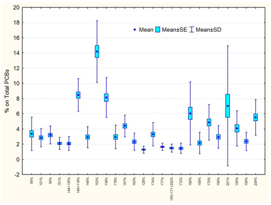 The PCB content was mostly dominated by eight congeners: PCB(149 + 118), PCB153, PCB138, PCB180, PCB170, PCB201, and PCB206, with contributions > 50% (Figure 2).
