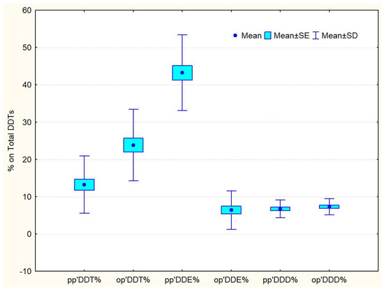 The relative contribution to the total DDT content (Figure 3) was pp′DDE (43.2%) > op′DDT (23.8%) > pp′DDT (13.2%) > op′DDD (7.3%) > pp′DDD (6.7%) >op′DDE (6.4%). For the first three isomers (pp′DDE, op′DDT, and pp′DDT), a similar trend was observed in the behavioral groups, while minimal differences existed for op′DDD, pp′DDD, and op′DDE (Table 4). The only significant difference between the groups was between (V) and (A) for pp′DDT, with a higher percentage in group (A). Typically, technical DDT is composed of pp′DDT (77.1%), op′DDT (14.9%), pp′DDD (0.3%), op′DDD (0.1%), pp′DDE (4.0%), op′DDE (0.1%), unidentified compounds (3.5%) [65], and a (pp′DDE/pp′DDT) ratio of 0.05. If the ratio (pp′DDE/pp′DDT) has high values, it can be deduced that the majority of the active substance (pp′DDT) has been degraded to pp′DDE, and, therefore, there were no recent deposits of insecticide into that ecosystem [66]. In all the zooplankton samples the pp′DDE/pp′DDT ratio had a mean value of 4.55, with a range from 0.78 to 12.97. Clearly, this is a value higher than 0.05 of the technical DDT, but is not so high as to suggest an historic introduction of the pesticide. The (pp′DDE/DDTs) ratio, as well as having a similar meaning to the (pp′DDE/pp′DDT) ratio, can also indicate the efficiency of the metabolic processes [67]. In fact, the (ppDDE/DDTs) ratio indicates the relative abundance of metabolized forms of DDT. In this study, zooplankton showed a ratio that varied from 0.23 to 0.65, with a mean of 0.43. A value of this ratio equal to 0.6 is considered critical, while higher values indicate that there are no new contamination inputs in the study area [68]. The value found in our samples thus highlighted an alarming situation.