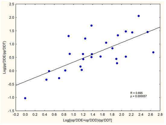 The concentration range of DDT impurities can vary widely. The total DDT content was found between 0.3% and 14.3% of the total weight of dicofol [78], although dicofol produced in China was reported to have on average 20% of DDT [73,79]. Given that in technical DDT, it is typically ~0.19 [80], and given that op′DDT shows a shorter half-life than pp′DDT in the environment [81], it seems reasonable to assume the influence of dicofol-type contamination when encountering an (op′DDT/pp′DDT) value > 0.2. In these samples, the mean value of this ratio was 2.42, ranging from 0.36 to 7.79. Values of this ratio > 0.2 were observed in 37% of the samples, and this indicates possible dicofol contamination. After applying the data log transformation to meet the criterion for normality, an attempt was made to evaluate whether there was a correlation between the [(pp′DDE+pp′DDD)/pp′DDT] and (pp′DDE/pp′DDT) ratios, which would have further confirmed the possible presence of dicofol. This is always linked to the degradation of the pp′-Cl-DDT impurity of dicofol, which, by degrading into pp′DDE, would increase the values of the ratios. The significant Pearson correlation coefficient (Figure 4) suggests this as a possible route of contamination for the analyzed zooplankton.